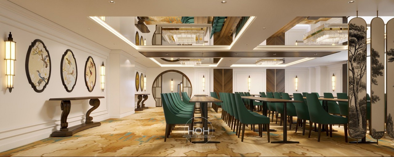The Indochine-style restaurant features a unique design, showcasing a creative modern approach with an artistic highlight of handcrafted Tiffany glass lights.